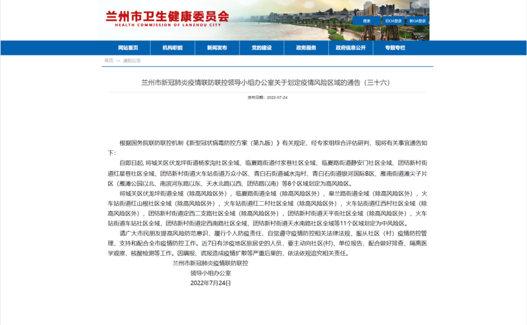 雁南街道滩尖子片区(雁滩公园以北、南滨河东路以东、天水北路以西、团结路以南)等8个区域划定为高风险区。