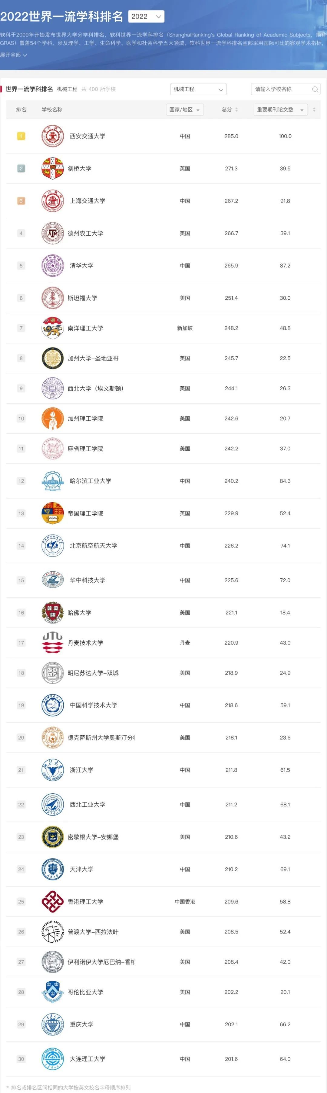 软科官网发布的《2022世界一流学科排名》工学领域机械工程学科排名。