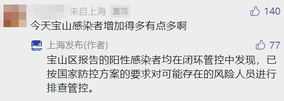有网友在“上海发布”评论区留言:今天宝山感染者增加得有点多啊?对此,上海发布回应:均在闭环管控中发现