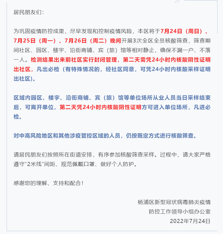 杨浦区:将于7月24日(周日)、7月25日(周一)、7月26日(周二)晚间开展3次全区全员核酸筛查。检测结果出来前社区实行封闭管理,第二天需凭24小时内核酸阴性证明出社区,凡出必检(有特殊情况的,经社区同意,可凭24小时内核酸采样证明出社区)。