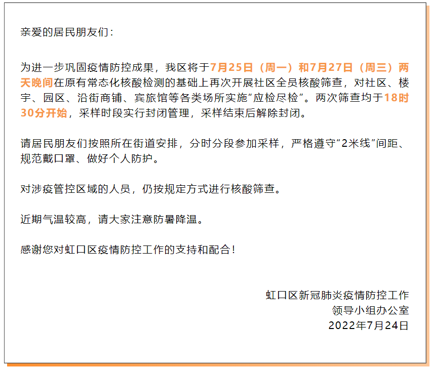 虹口区:将于7月25日(周一)和7月27日(周三)两天晚间在原有常态化核酸检测的基础上再次开展社区全员核酸筛查。