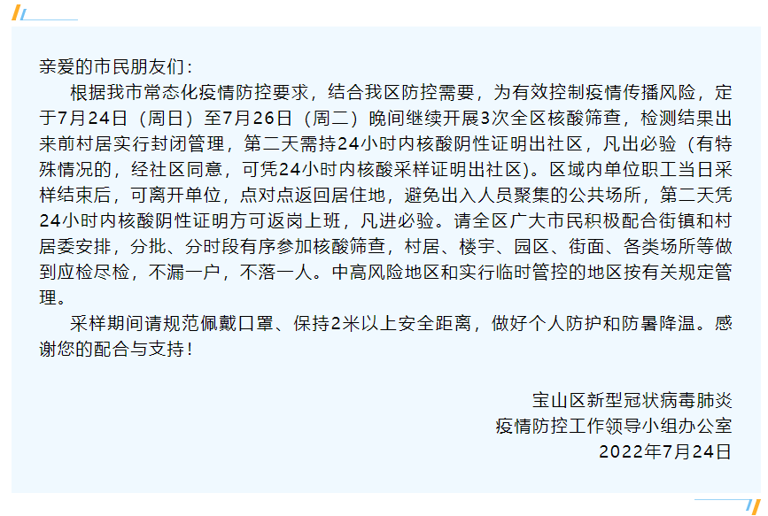 此前,宝山区已于7月21日(周四)至7月23日(周六)晚间,连续三天开展了三次全区核酸筛查。