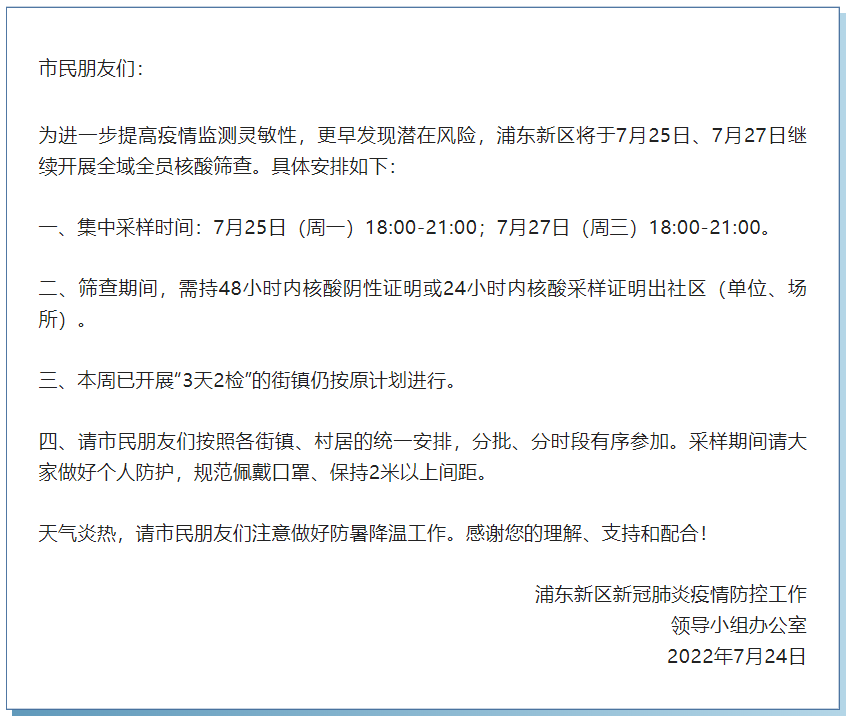 浦东新区:将于7月25日、7月27日继续开展全域全员核酸筛查。