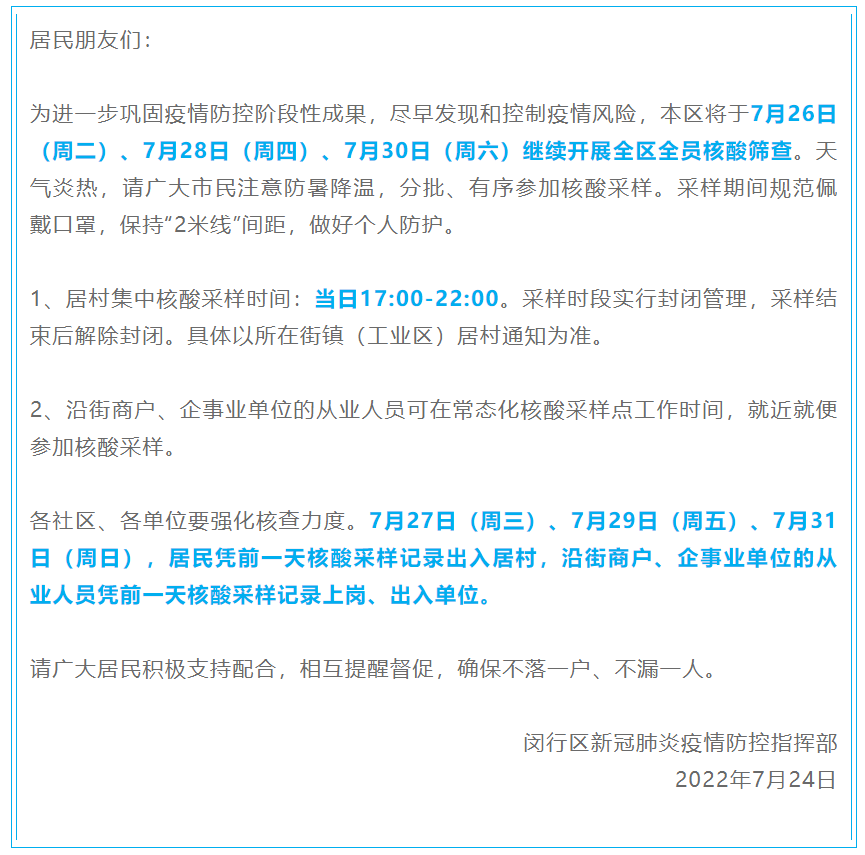 闵行区:将于7月26日(周二)、7月28日(周四)、7月30日(周六)继续开展全区全员核酸筛查。