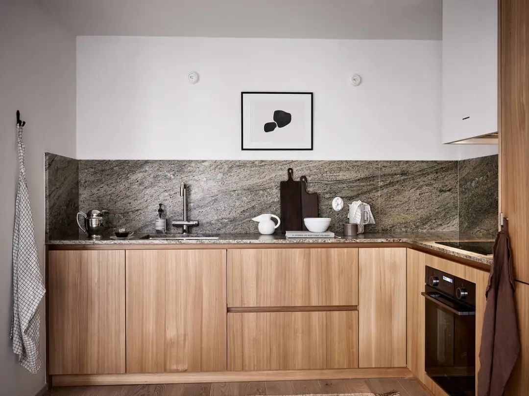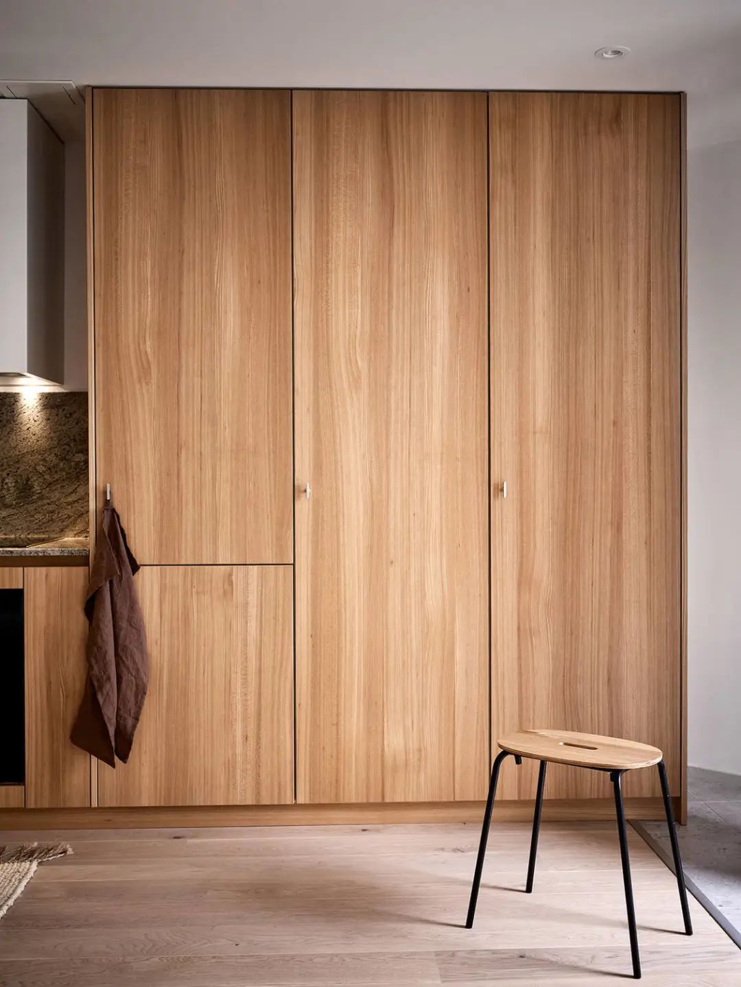 厨房的空间布局很简单,选用的柚木橱柜,来自瑞典品牌 Kvänum;烤箱、微波炉、冰箱、冰柜、洗碗机、电磁炉等电器,均是嵌入橱柜内部进行收纳。