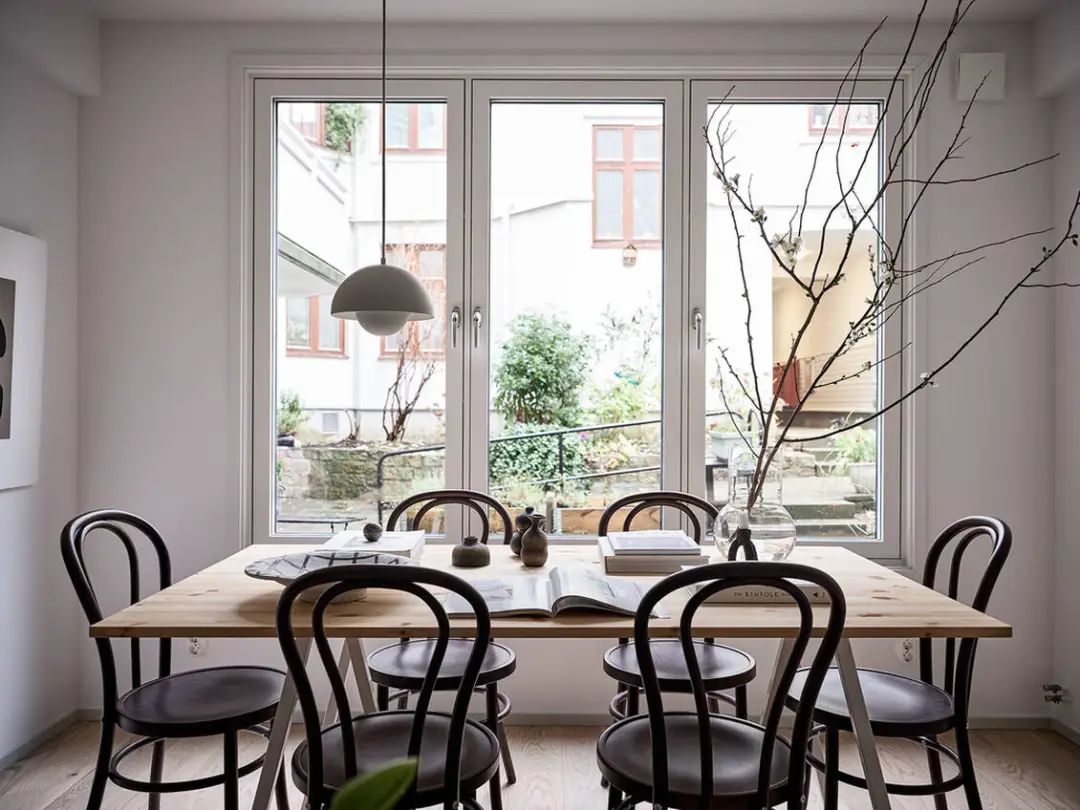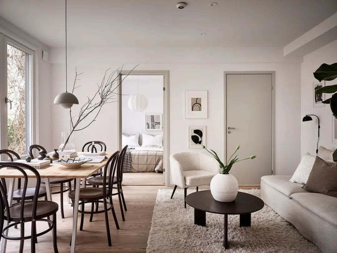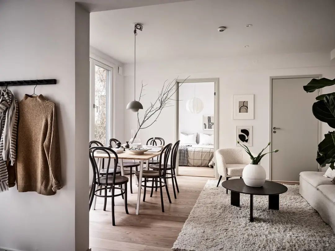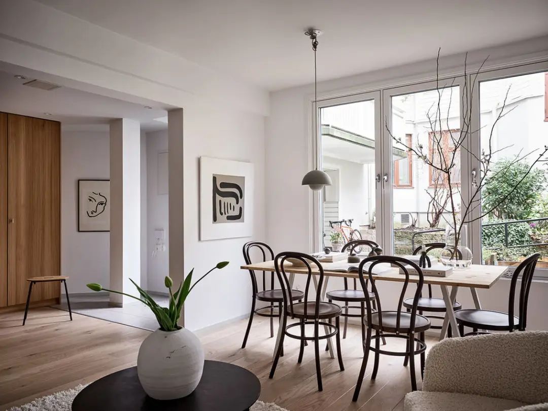 今天分享的案例位于瑞典马约纳市。这座公寓在一层,外边有一处空地用于日常休憩;同时,2021 年才完成装修的缘故,整个空间看上去特别新。