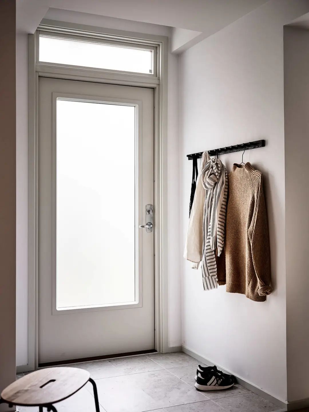 门厅的设计很简洁,墙上有挂衣杆,负责收纳外出的包包、衣物;地面采用耐磨、易清洁的花岗岩地砖,这样能避免将外界的尘土带入室内。