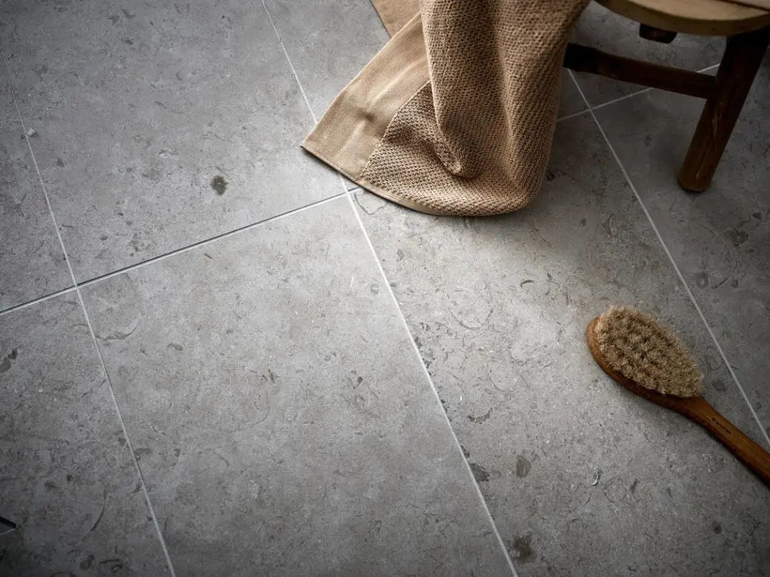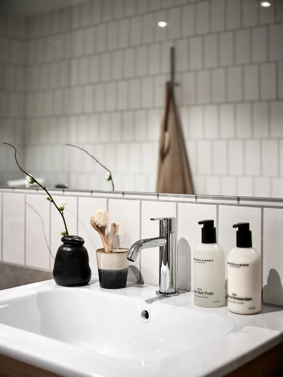 灰色瓷砖从地面延伸至墙面,不会制造视觉割裂感;接着再用小白砖铺满全屋,让空间显得更为宽敞。
