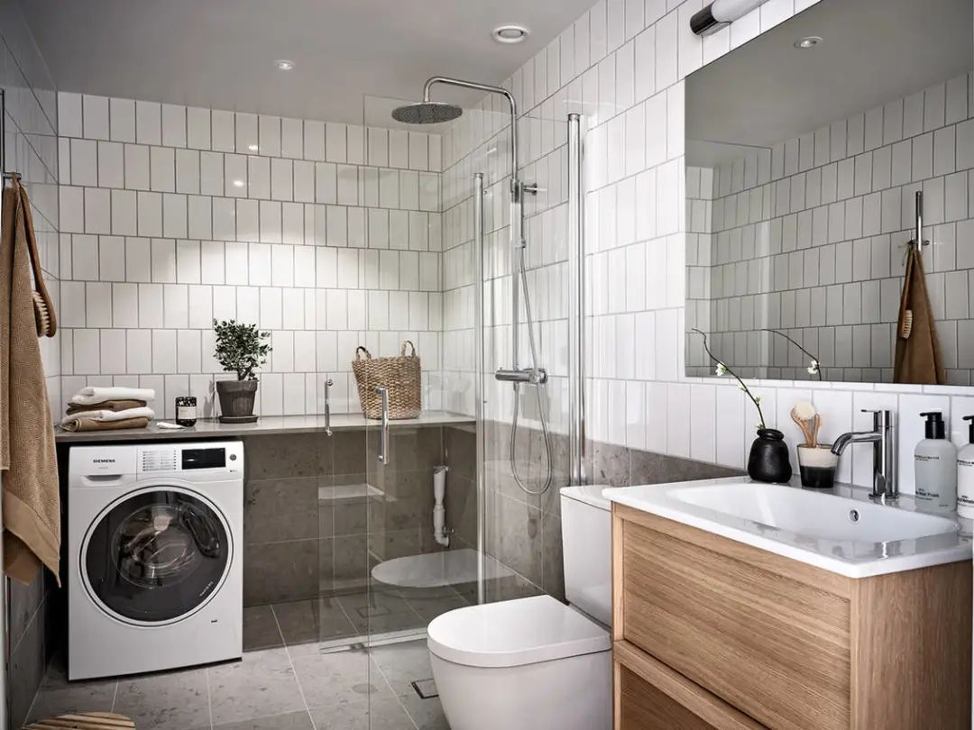 卫生间面积极其宽敞,能塞下洗衣机、马桶、单盆浴室柜,淋浴面积也足够一人使用。