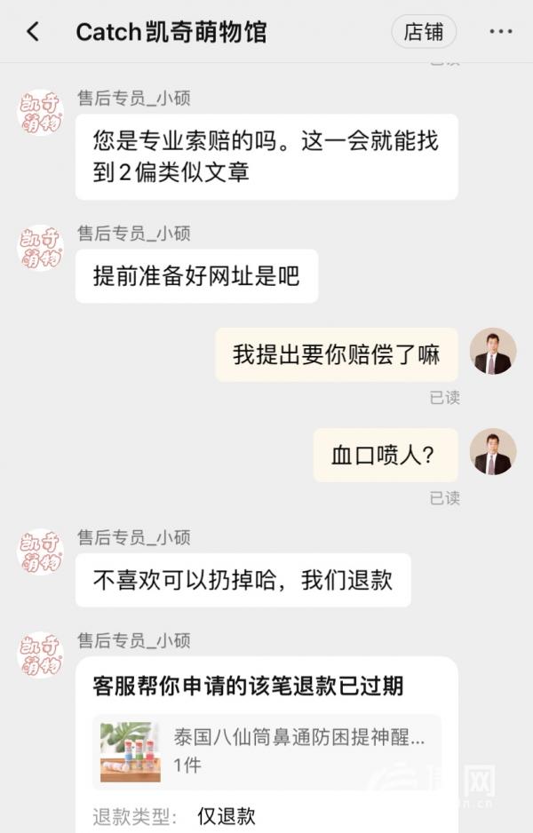 对此,客服表示:“不喜欢可以扔掉,可以退款。”在李先生找来相关法律法规链接后,客服人员答复:“您是专业索赔的?这一会就能找来类似文章?”