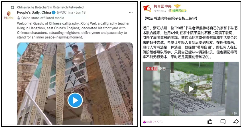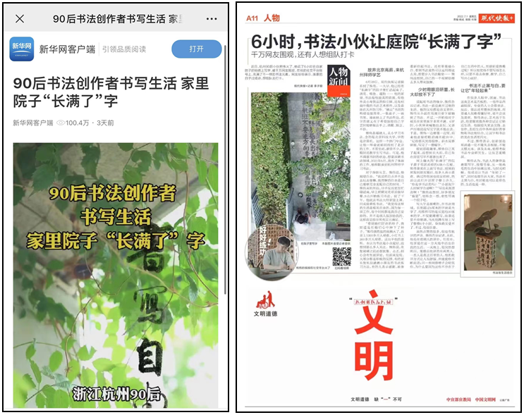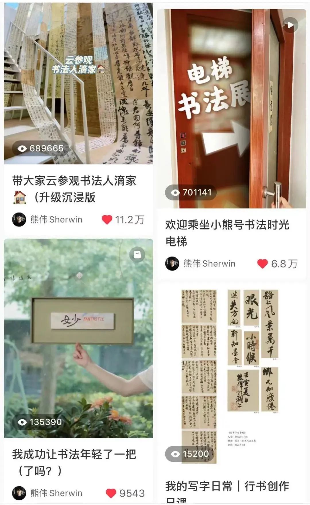 在他的社交平台账号上,充满了不一样的书法元素,比如“书法长卷瀑布”,灵感来源于明朝书法家的长卷轴;花50个小时“唤醒”时光墨条,放慢节奏“虚度”时光;吹出文艺风的空调,破旧家具开启美颜计划……