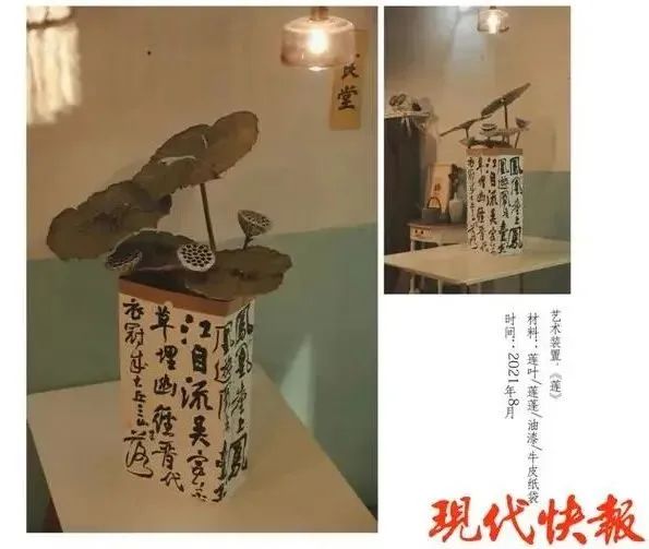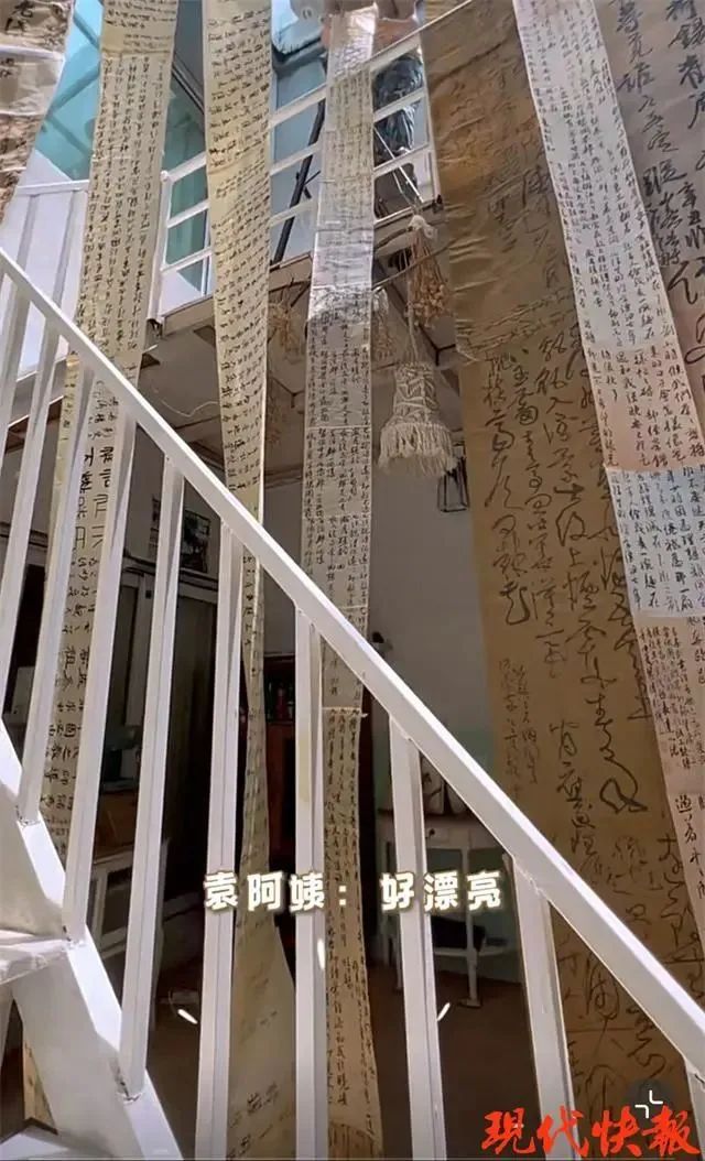 6月29日,现代快报记者联系到了熊伟。一大早,他已经在“长满字”的院子里忙活起来了,浇花、喂鱼、遛狗……他的家里,书法是他最美的软装,有给外卖小哥饮品的指引牌,还有枯荷叶做的书法艺术摆件,以及悬挂在天井的习作。“拂云”书房的构成也很简单,一张桌子、一面书架,墙面贴上了书法作品,“拂云”名字的意义在于希望鼓励自己学艺时能够取法乎上,清醒、独立、不俗。