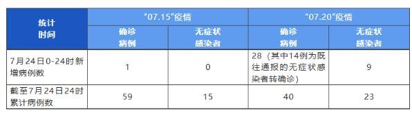 “07.20”疫情新增本土确诊病例28例(其中14例为既往通报的无症状感染者转确诊),新增本土无症状感染者9例。截至24日24时,本起疫情累计报告本土确诊病例40例,本土无症状感染者23例。
