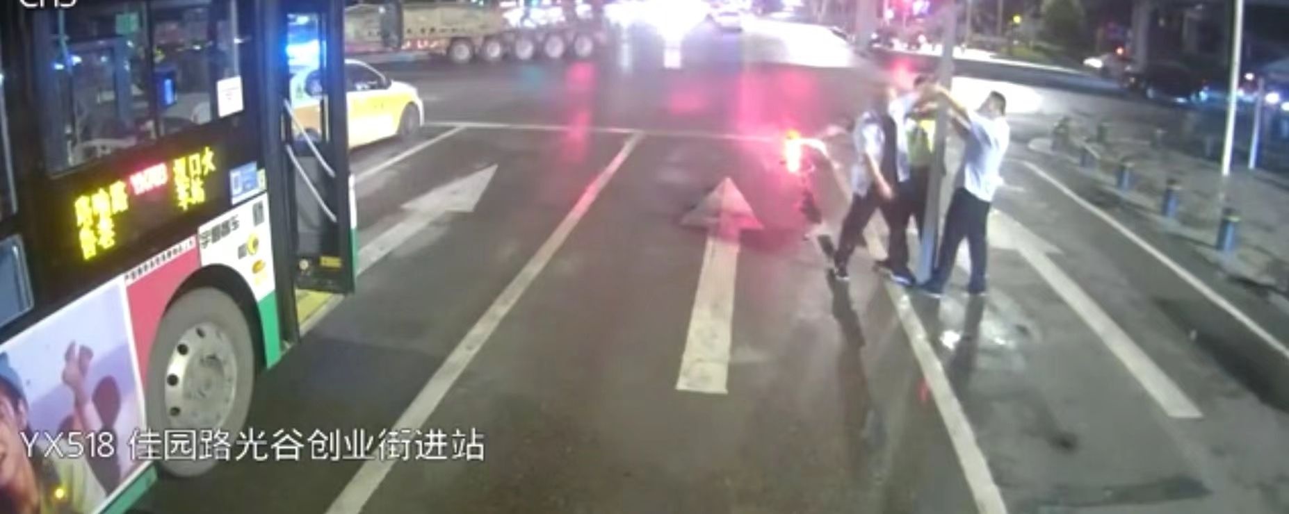 长江日报大武汉客户端7月25日讯 道路上方掉落的电缆线悬在半空中变成“拦路虎”,过往车辆通行受阻。路过的公交司机张勇、江威与民警一起,托举电缆线约38分钟,保证交通畅通。这一幕发生在7月24日凌晨的武汉街头。