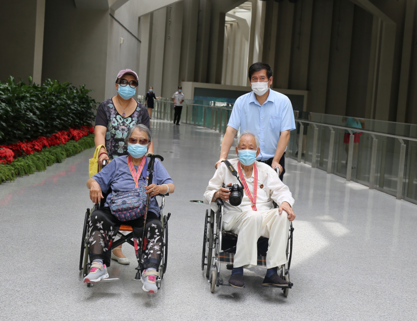 在参观队伍中,有两位90多岁、头发花白的老人格外引人注目,他们一坐一行,胸前都挂着“中国人民志愿军抗美援朝出国作战70周年”纪念章。缓慢行走的是宋振英,坐在轮椅上的是他的老伴李桂馨,他们不仅是夫妻还是战友,都参加过抗美援朝战争。二人相扶相伴登上奥林匹克塔后,宋振英老人兴奋地说:“今天的天气好,能看到大半个北京城,我们参加抗美援朝就是为了保家卫国,这繁华盛世就是我们最想看到的景色。”