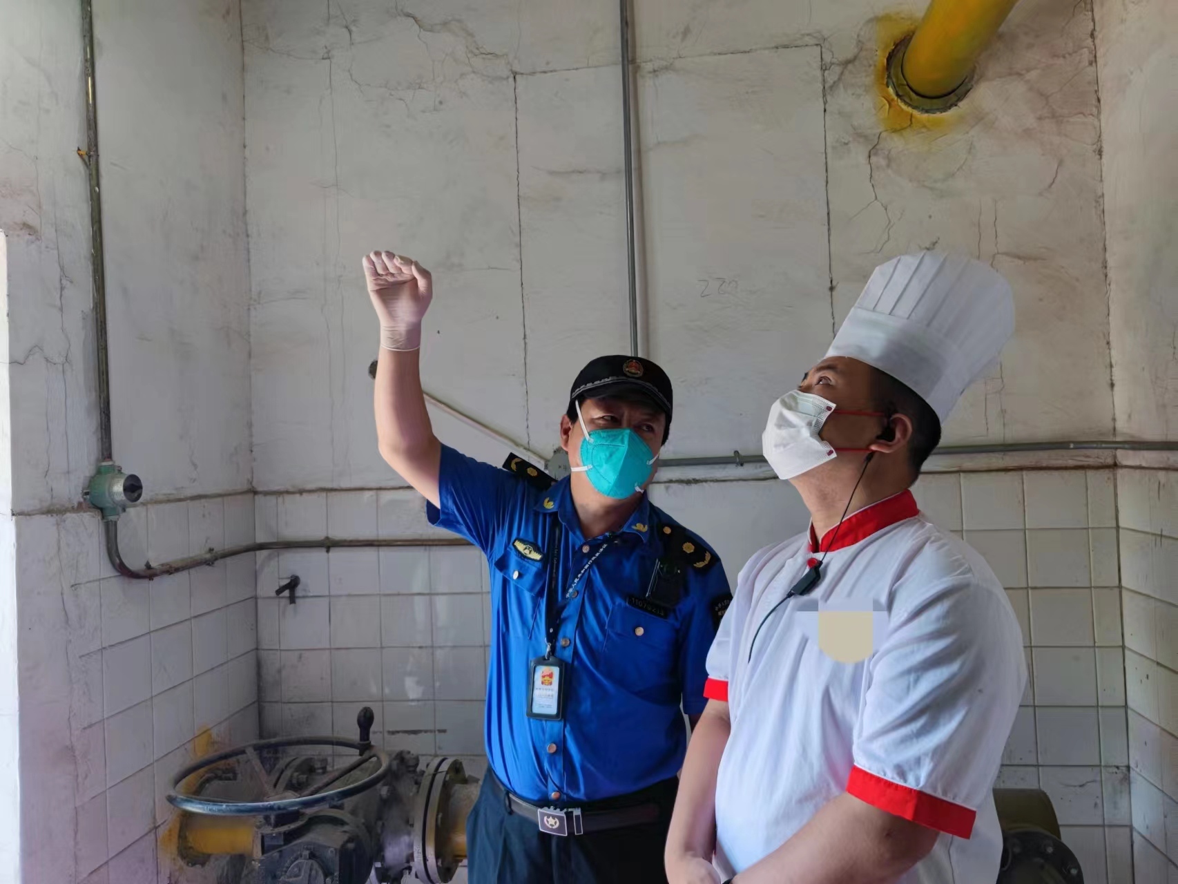 7月21日下午,记者跟随丰台街道综合行政执法队队员一起,检查了丰台北路某餐饮门店的燃气安全工作情况。在店内就餐区域,执法队员先后检查了燃气安全报警器、餐桌燃气灶台等重点点位安全情况,整体情况良好。