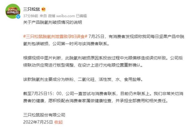 25日15时13分,@三只松鼠官方账号发布情况说明表示,脱氧剂破损原因系投放过程中光眼偏移造成误切所致,愿积极配合消费者家属做健康检查,并承担全部费用和相关责任。