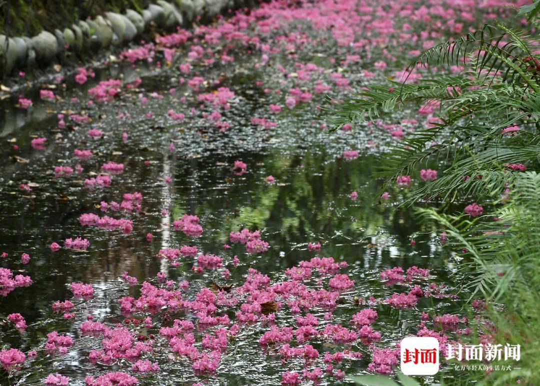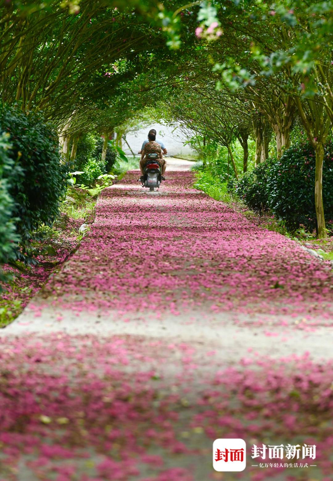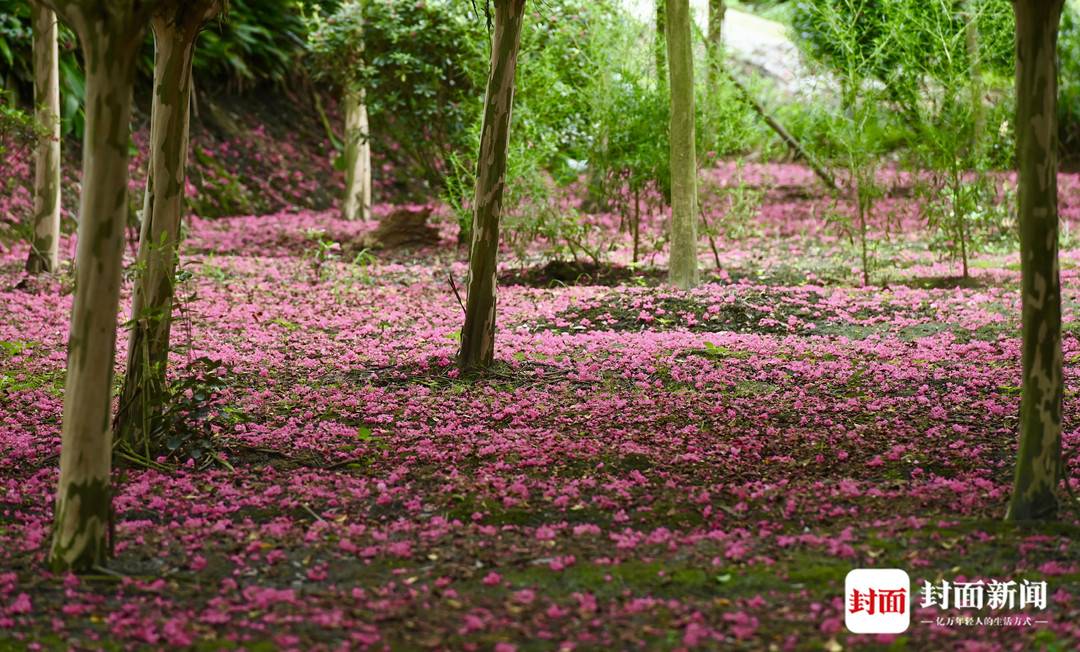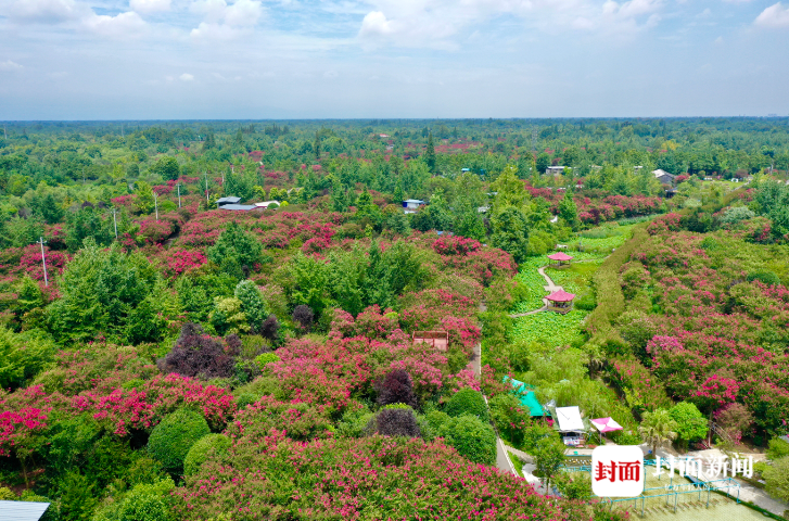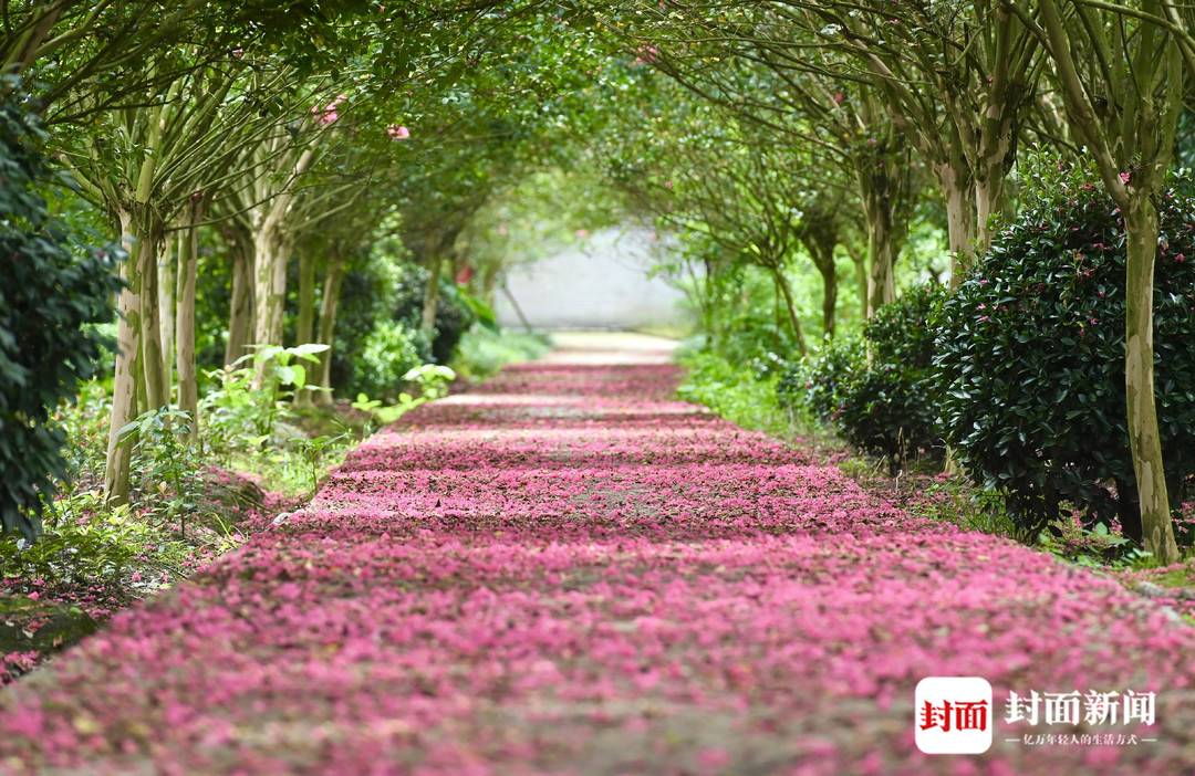 正是紫薇花开的季节,成都温江区和盛镇紫薇公园里,满眼姹紫嫣红,树上树下红彤彤一大片。漫步在铺满紫薇花的小道上,这个夏天也变得自在又惬意。