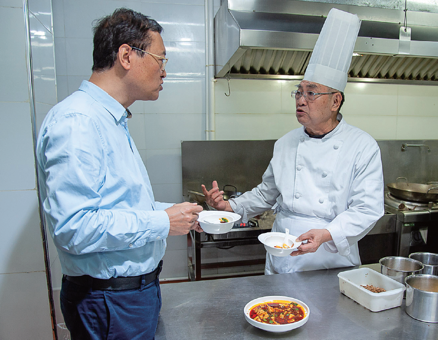作者李作民(左)和王开发(右)探讨麻婆豆腐