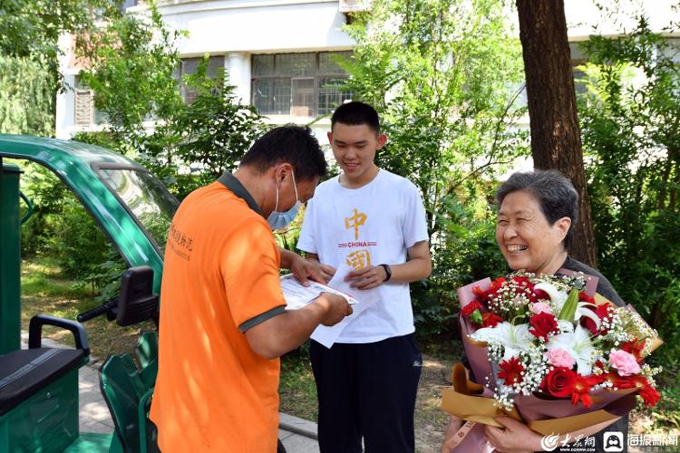 10时50分,邮递员安泽清来到黄河小区,赵宇飞和他80岁高龄的奶奶已激动地到楼下等候。安泽清将一束祝福鲜花和录取通知书郑重送到他们手上。赵宇飞激动地打开通知书,呈现在眼前的是激光雕刻、创意满满的立体二校门。