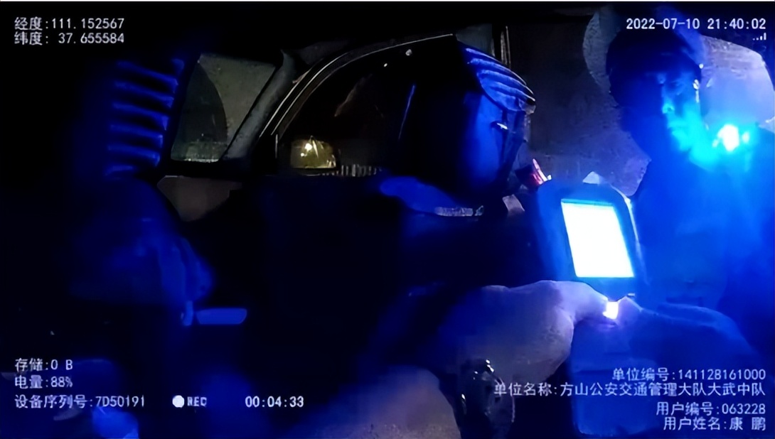 2022年7月10日21时38分,方山县公安局交警大队大武中队在S218省道(岢大线)大武村路段在对一辆黑色大众小型汽车例行检查时,发现驾驶人董某有酒后驾驶嫌疑,后经呼气式酒精测试仪检测,其酒精含量为29.2mg/100ml,属于饮酒后驾驶机动车。