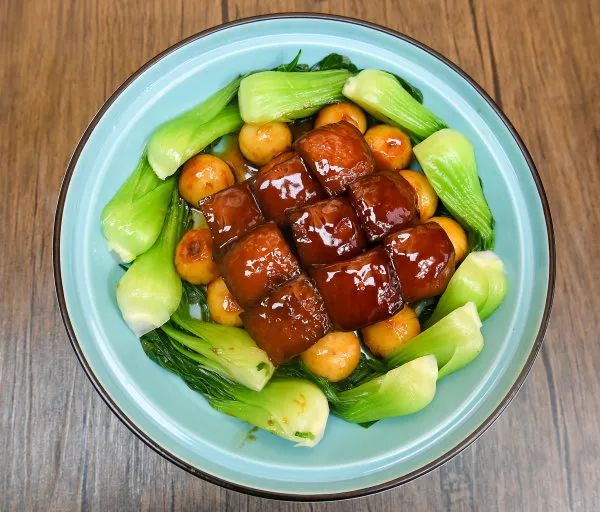 一道摆盘精致的红烧肉很快上桌。盘中红烧肉色泽红亮、晶莹剔透;小菜心清新嫩绿、饱吸鲜香,尽显简雅高档。