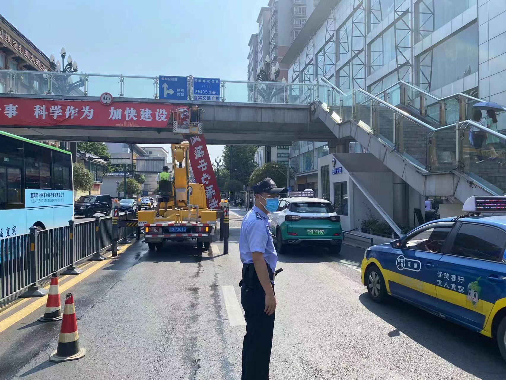 近日,宜宾市人民路天桥宣传标语钢架意外脱落,砸在了路过的一辆“环卫车”上,原本双向四车道被截断,仅剩一条车道可供通行,事发地点处老城区交通要道,车流量非常大,很快交通就严重堵塞。