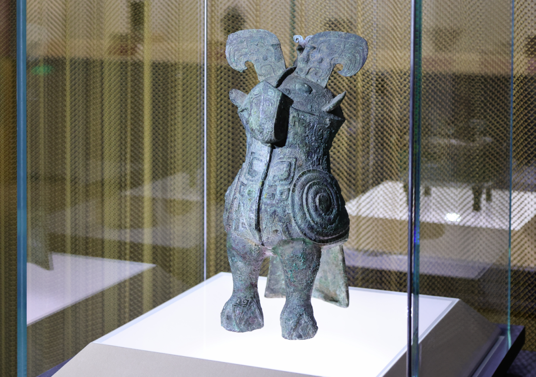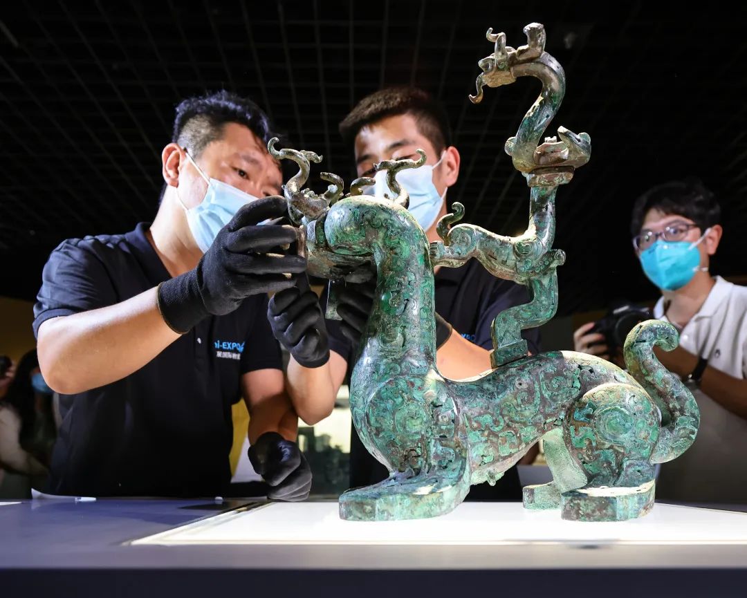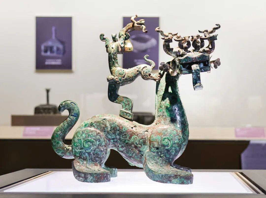 镶嵌绿松石神兽由若干绿松石和青铜摆件组装而成。