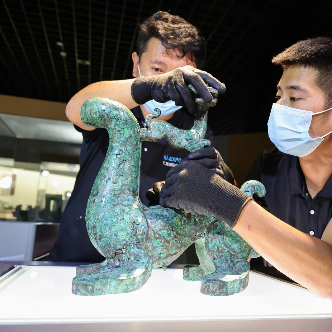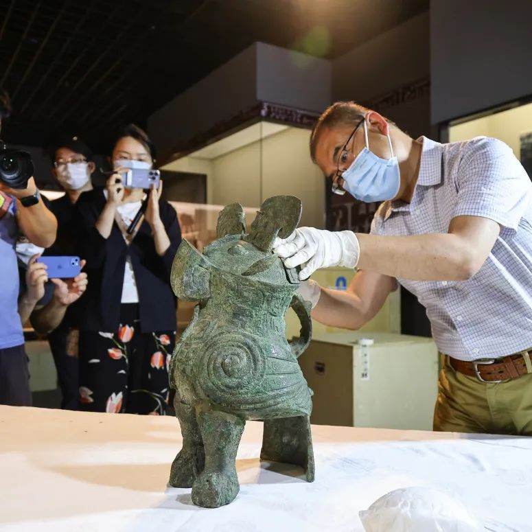 打开层层木箱,工作人员小心翼翼地捧出河南博物院的镇馆之宝“妇好鸮尊”(鸮,音同萧)。
