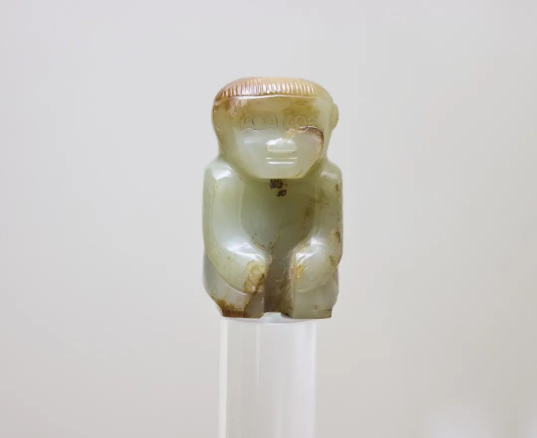 玉佩上的小人双手扶膝,额头宽阔,蒜头鼻,微微张嘴。玉佩底部有放在器物上的痕迹,证明了它是一件饰品。