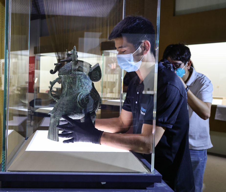 昨天下午,妇好鸮尊、镶嵌绿松石神兽及跽坐人形玉佩三件重磅展品在上博第一展厅开箱布展。