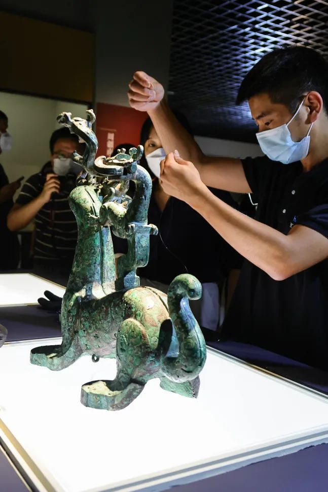 这件文物从青铜材料本身的属性到镶嵌绿松石的工艺,都体现了当时精巧的工艺水平特征,极为罕见。
