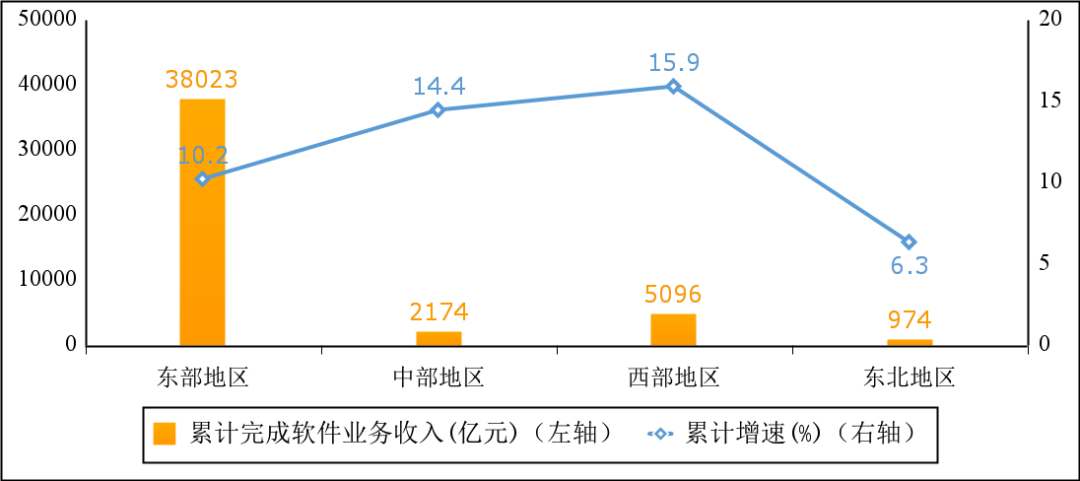 东部地区软件业务收入平稳增长,西部地区增势突出。上半年,东部地区完成软件业务收入38023亿元,同比增长10.2%,增速较1—5月份提高0.3个百分点;中部地区完成软件业务收入2174亿元,同比增长14.4%,高出全行业整体增速3.5个百分点;西部地区完成软件业务收入5096亿元,同比增长15.9%,高出全行业整体增速5个百分点;东北地区完成软件业务收入974亿元,同比增长6.3%,增速较1—5月份提高0.1个百分点。四个地区软件业务收入在全国总收入中的占比分别为82.2%、4.7%、11.0%和2.1%。