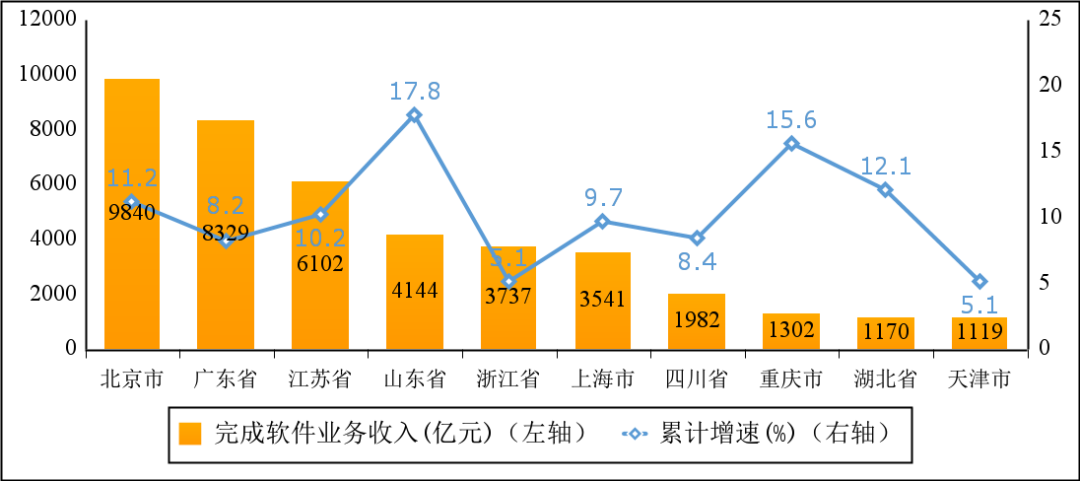 主要软件大省平稳向好发展。上半年,软件业务收入居前5名的省份中,北京市、广东省、江苏省、山东省、浙江省软件业务收入分别为9840亿元、8329亿元、6102亿元、4144亿元和3737亿元,分别增长11.2%、8.2%、10.2%、17.8%和5.1%,五省(市)合计软件业务收入32152亿元,占全国比重为69.5%,占比较去年同期回落0.4个百分点。