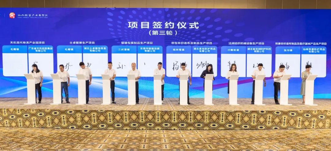 签约仪式上,市政府与武汉纺织大学签订市校合作协议、毛嘴镇与武汉纺织大学服装学院就“江汉服装产业创新发展研究中心项目”签约、毛嘴镇与全国重点裤业产销基地签订战略合作协议。