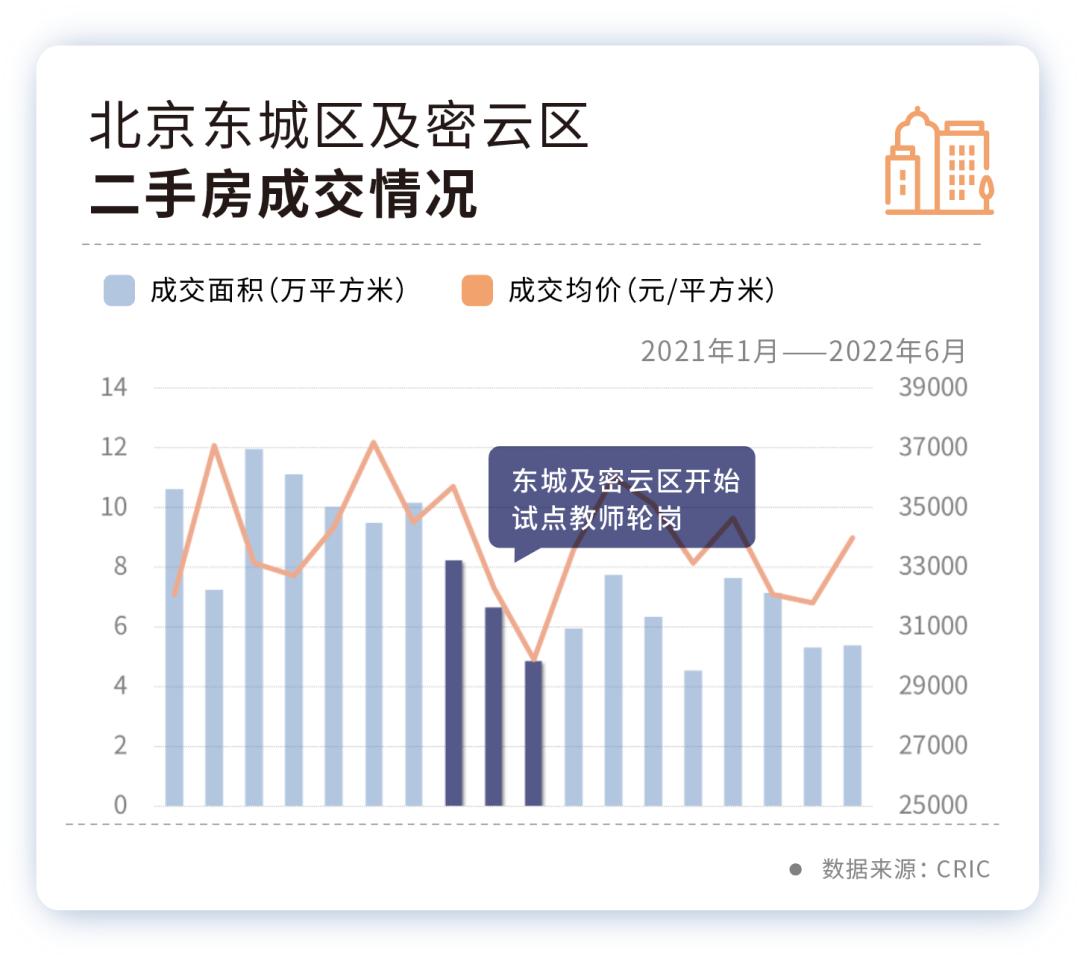 如北京东城区及密云区最早试点教师交流轮岗,8月政策颁布后,克而瑞研究数据显示:东城区、密云区的二手房成交量和均价双跌,从2021年7月成交面积10.15万平方米跌至10月成交面积4.86万平方米,跌幅达52%,2021年10月北京东城区及密云区二手房成交量和均价也是2021年全年最低。
