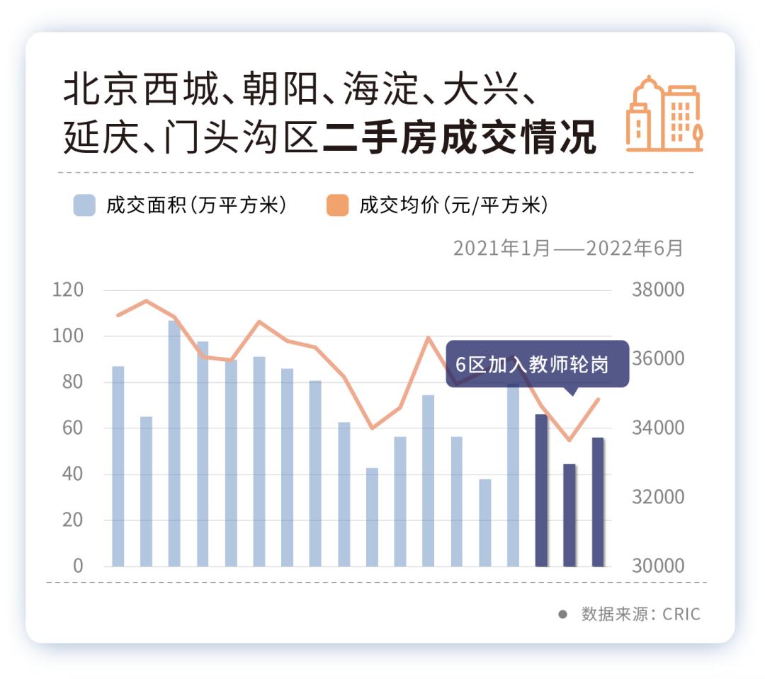 2022年4月政策颁布,5月,北京西城、朝阳、海淀、大兴、延庆、门头沟6区二手房成交量和均价双跌,成交面积由2022年3月的79.41万平方米跌至5月的44.5万平方米,跌幅44%。