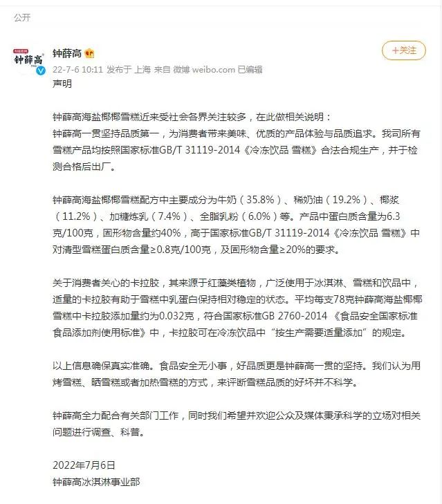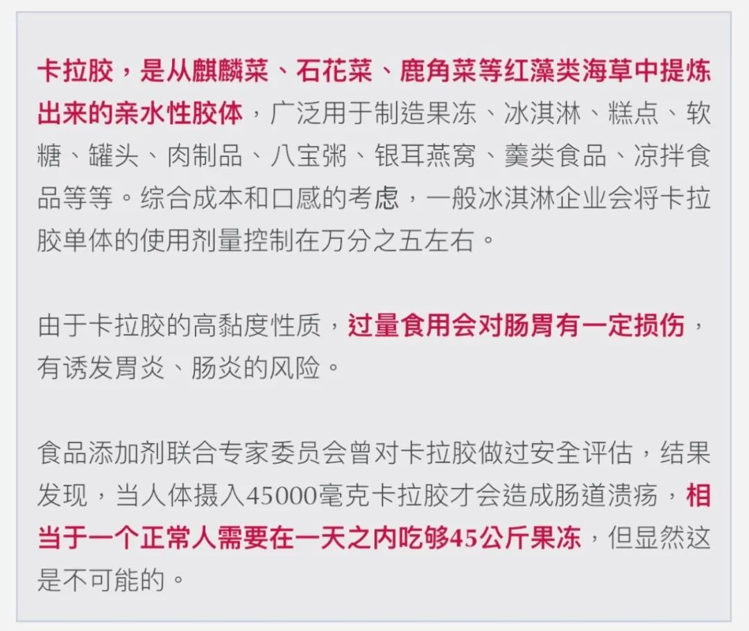 关于其食品添加剂成分--卡拉胶,虽然也受到质疑,但是根据根据国家《食品添加剂使用标准》的要求这些胶可“按生产需要适量使用”。并且钟薛高天猫旗舰店客服,店铺内的产品均严格按照国家相关标准添加,可放心食用。