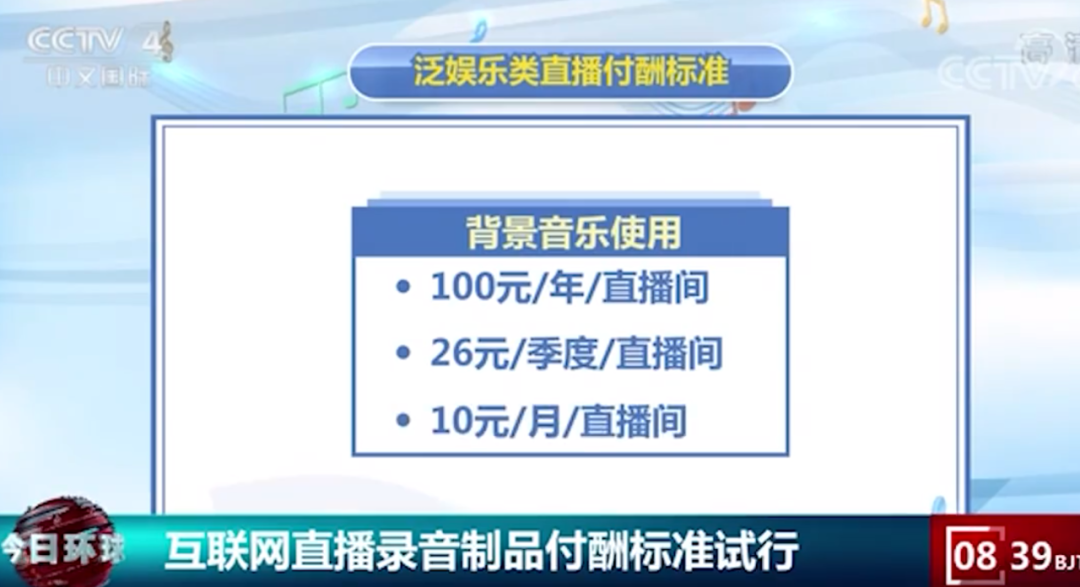 “获酬权”问题讨论的核心就是报酬的标准怎么来定,中国音像著作权集体管理协会作为著作权集体管理组织,向全社会公布了直播间使用音乐的付酬标准:付费义务主体为使用录音制品的主播和平台。为了有效实施,该试行标准面向平台,再由平台和主播分摊成本。将直播间类型划分为,使用K歌+背景音乐的直播间、单纯使用背景音乐的直播间和使用音乐的电商直播间,每年、每季度、每月的收费标准,分别为300元、83元、29元;100元、26元、10元;10000元、2777元、980元。从7月25日开始试行。