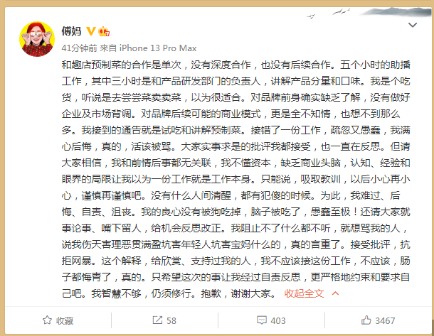 7月26日,傅首尔发布微博表示和趣店预制菜的合作是单次,没有深度合作,也没有后续合作。傅首尔称,“我接到的通告就是试吃和讲解预制菜。接错了一份工作,疏忽又愚蠢,我满心后悔,真的,活该被骂。”