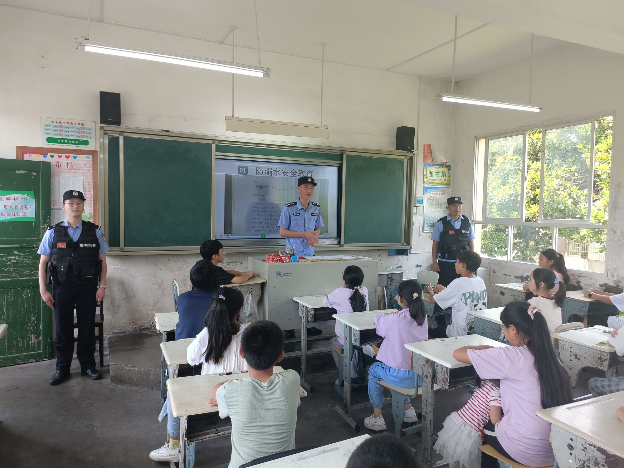 民警深入学校,走上讲台,向学生上暑假安全法制课。
