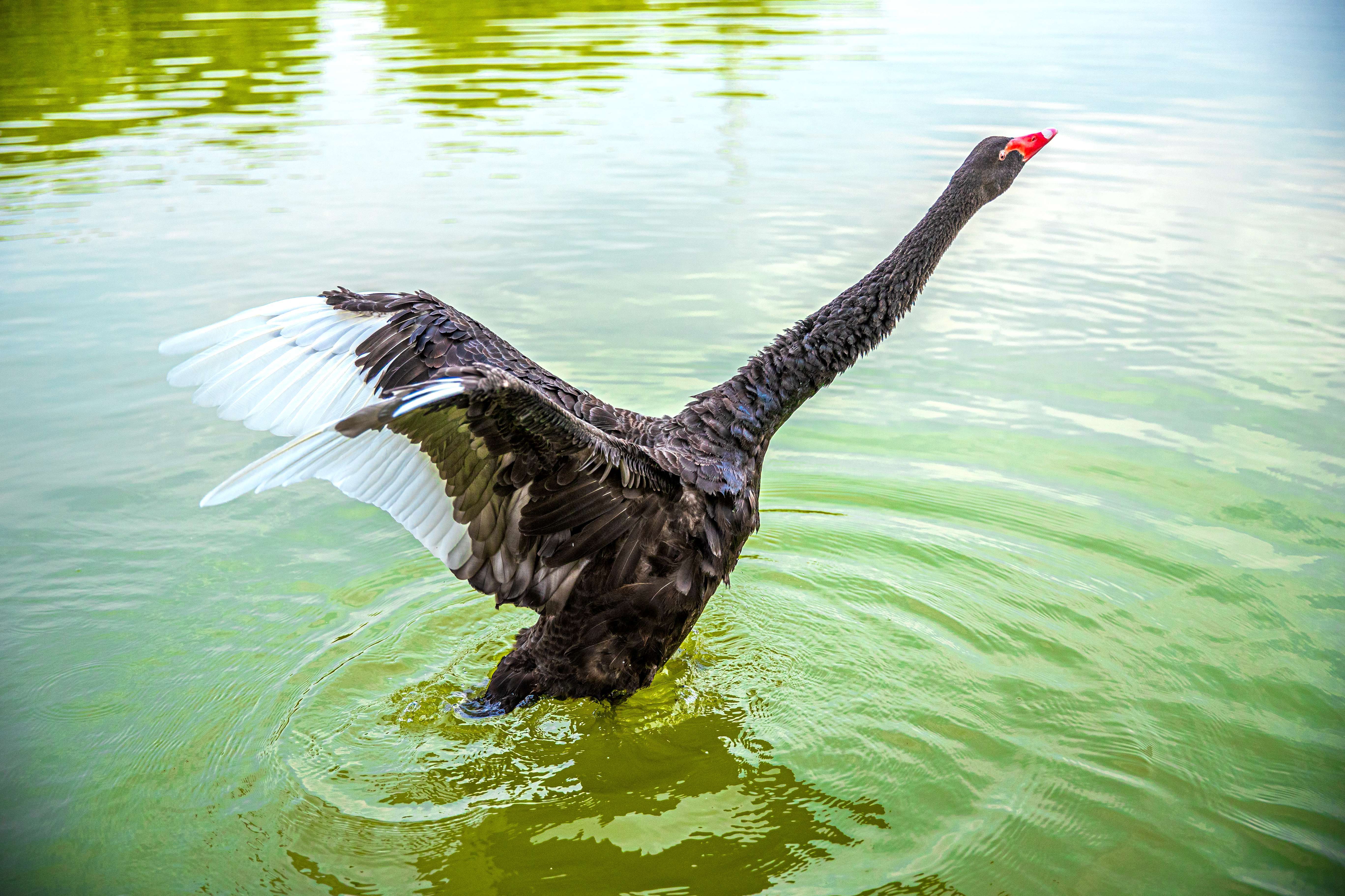 黑天鹅在湖面扑棱着翅膀。原梓峰摄