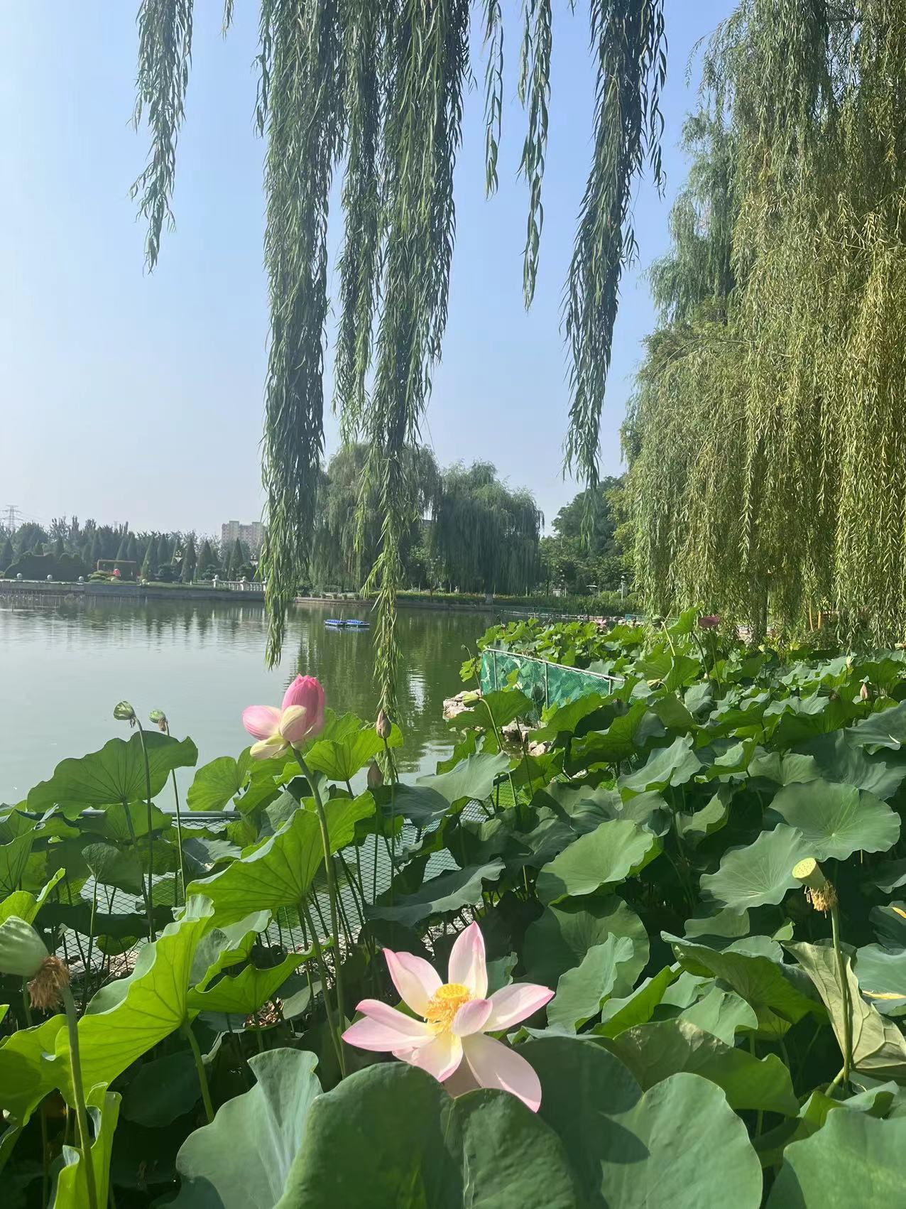 周边水面上丛丛荷叶中暗香浮动,几只荷花摇曳其间,不时有黑天鹅在一池碧水中扑棱起翅膀,游人或是在湖边坐赏美景,或是石阶小径上闲庭信步,或是在大草坪上撒欢,或是在五颜六色的花丛中嬉戏,园内每一处细节不可谓不细心,不可谓不精致,确实是一个夏日消暑纳凉游玩赏景的绝佳去处。