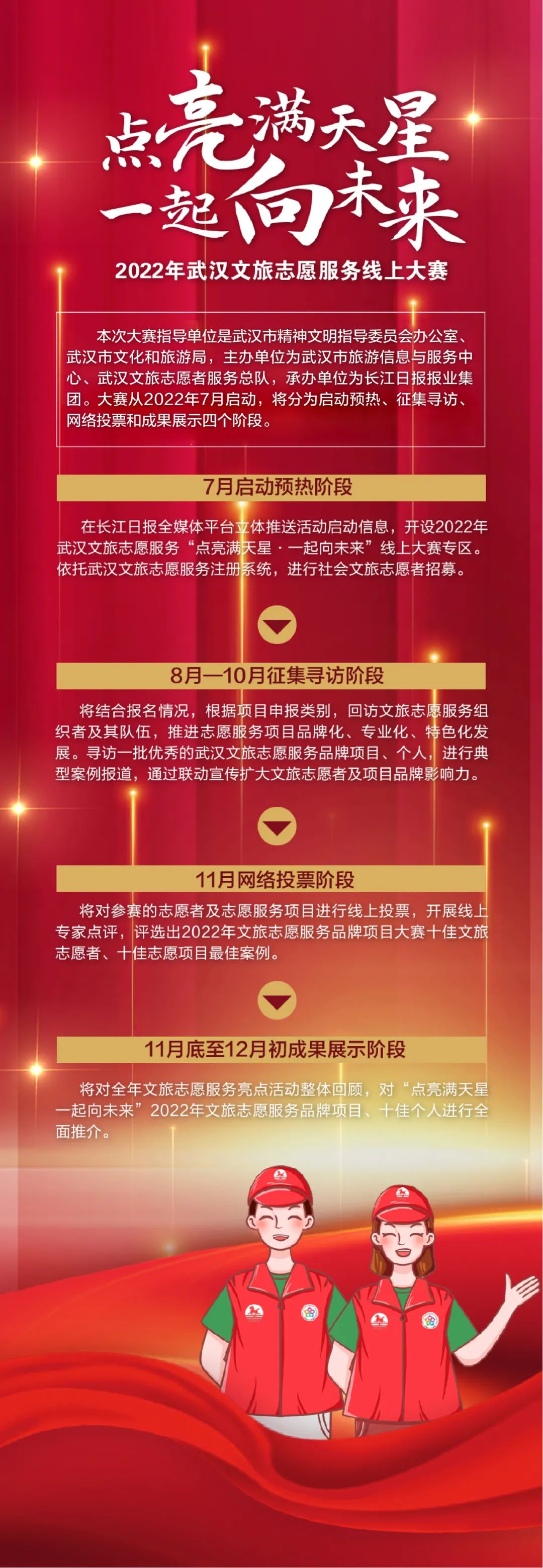 为助力新时代文明实践,广泛开展贴合实际、形式多样的文化和旅游志愿服务,营造向上向善、互帮互助的良好社会风尚,武汉市文化和旅游局、武汉市精神文明指导委员会办公室联合下发《武汉市2022年文化和旅游志愿服务工作实施方案》指出,以倡导文明旅游为重点,以创新工作机制为突破口,推动文化和旅游志愿服务高质量发展。