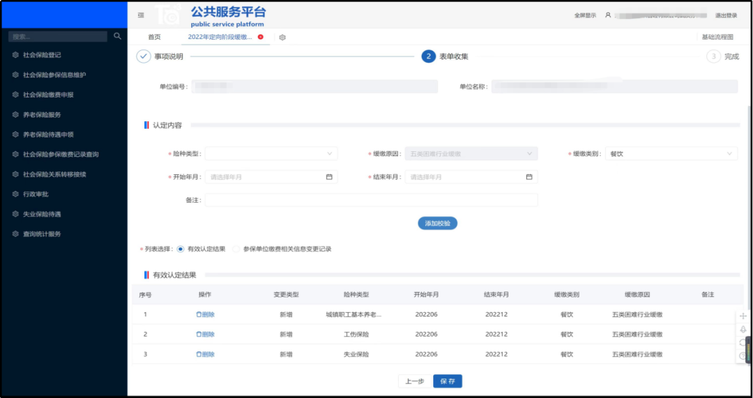 5.依次选择养老/工伤/失业保险,参照上述步骤录入险种缓缴信息;