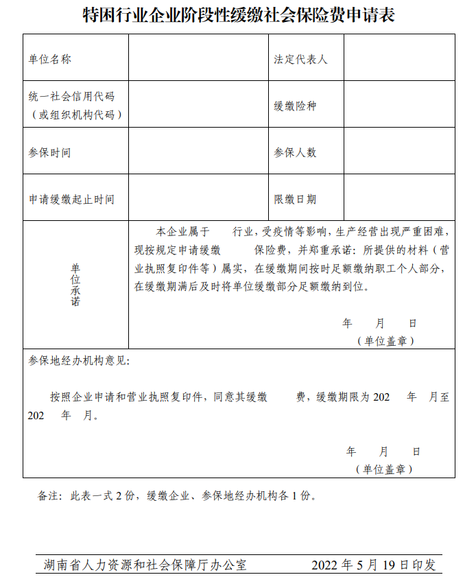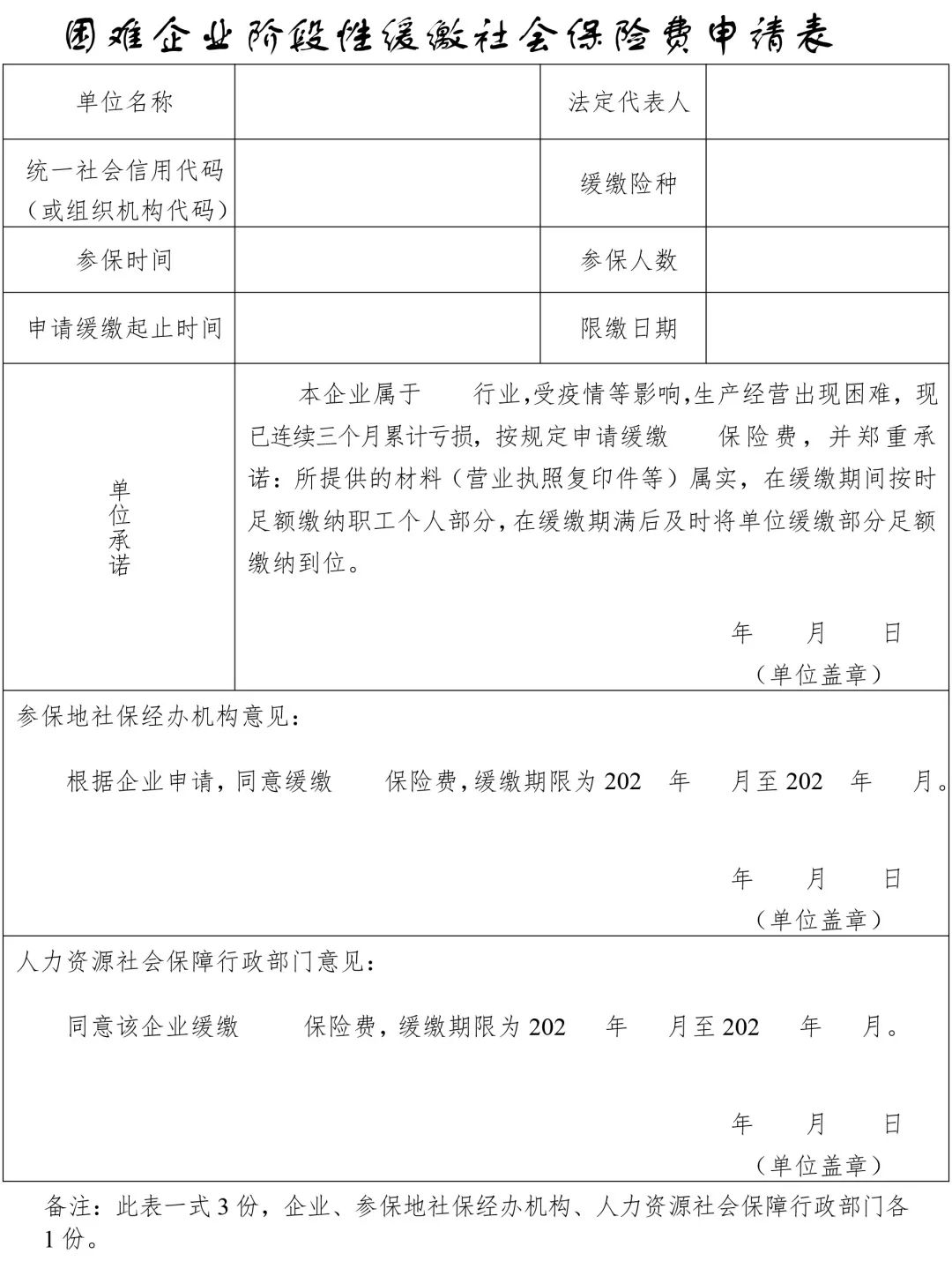 (二) 扩围行业困难企业申请缓缴社会保险费,需提供《困难企业阶段性缓缴社会保险费申请表》、营业执照复印件、累计亏损财务报表等资料,由参保地人力资源社会保障部门会同相关部门审批。