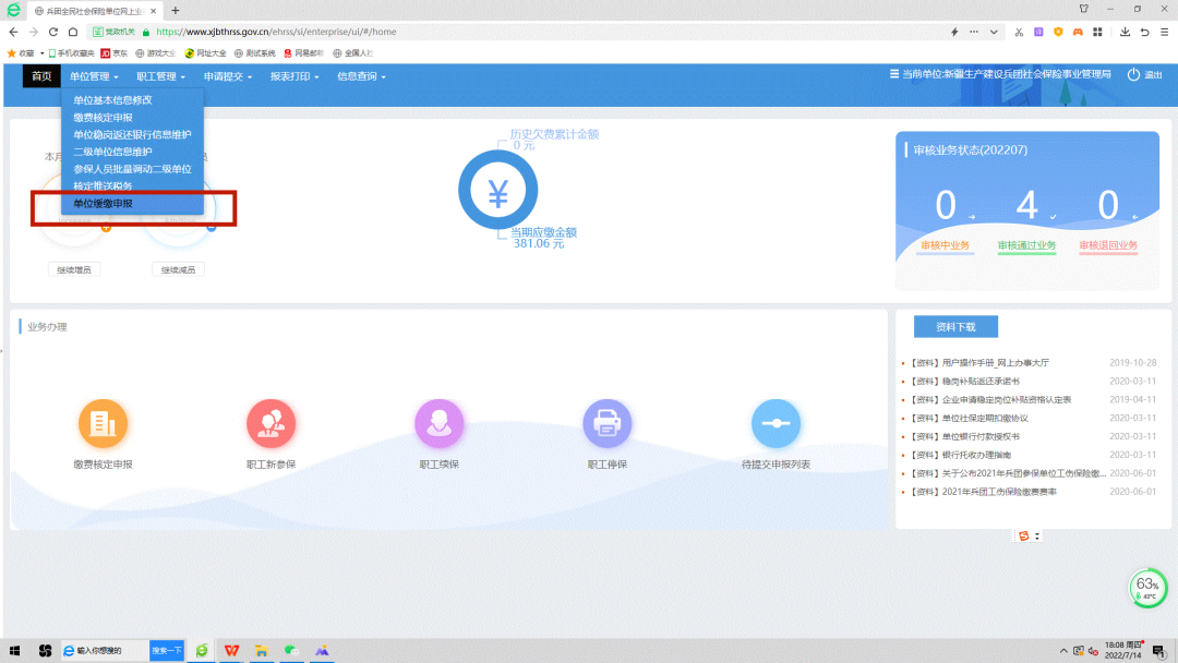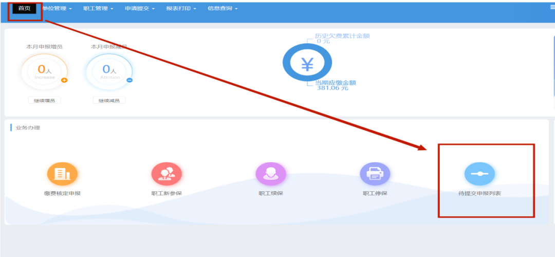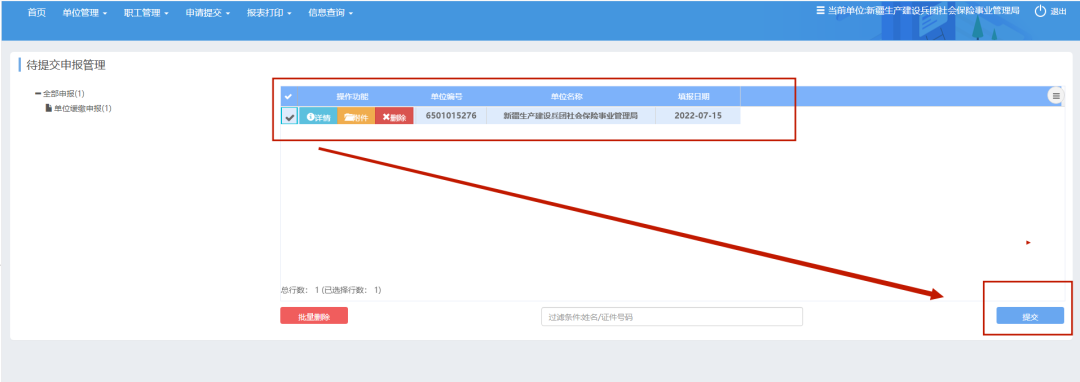 单位缓缴申报提交:首页—待提交申报列表—选择待提交项目—提交