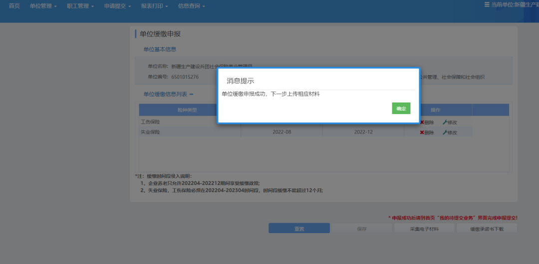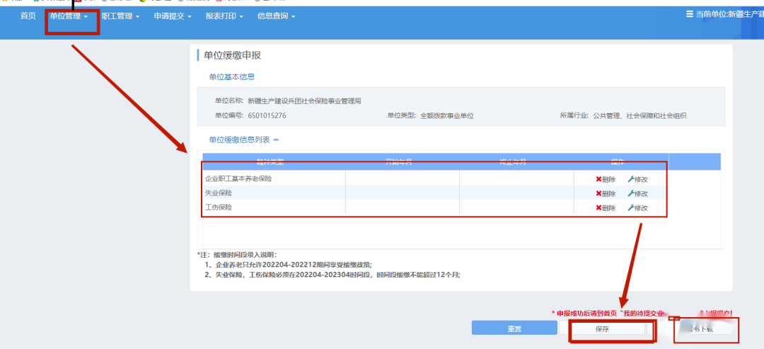 单位缓缴申报信息填写:选择“缓缴险种”—修改“缓缴起止时间”—保存—下载缓缴承诺书填写盖章并生成图片格式—上传相应材料—保存
