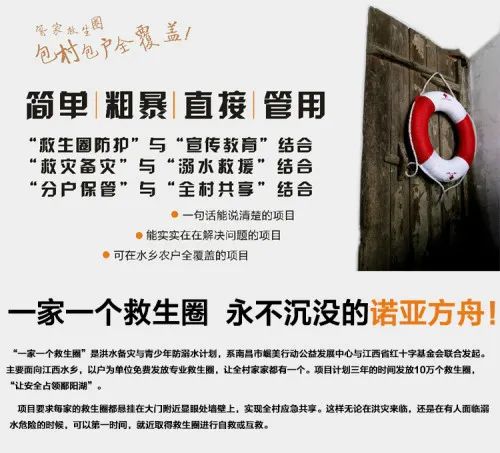 “一家一个救生圈”是由江西省红十字会组织发起、爱心企业积极参与捐赠救生圈的项目,该项目主要面向水患易发乡村,以户为单位免费发放专业救生圈,并要求每家的救生圈都悬挂在大门附近显眼处墙壁上,实现全村应急共享。