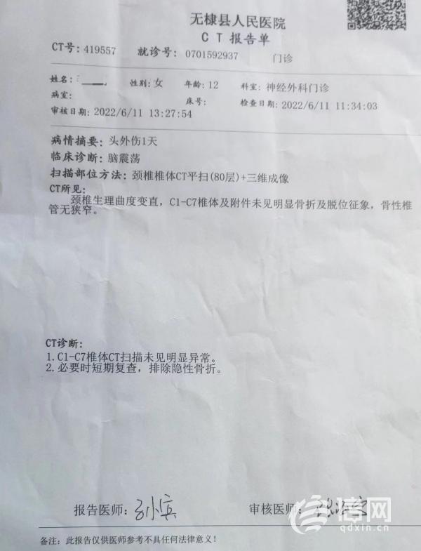 信网7月26日讯(记者 赵宝辉)李先生的女儿是滨州市无棣县清华园学校(以下简称“清华园学校”)的六年级学生,6月10日那天,因为在上课时跟同学递零食,遭到了班主任老师的体罚。这个12岁的女孩被诊断为脑震荡,门牙也松动了。拿着医院的诊断结果,李先生决心要为女儿讨个说法。信网(热线0532-80889431)联系了清华园学校,校方确认事情基本属实,涉事班主任已被停课。
